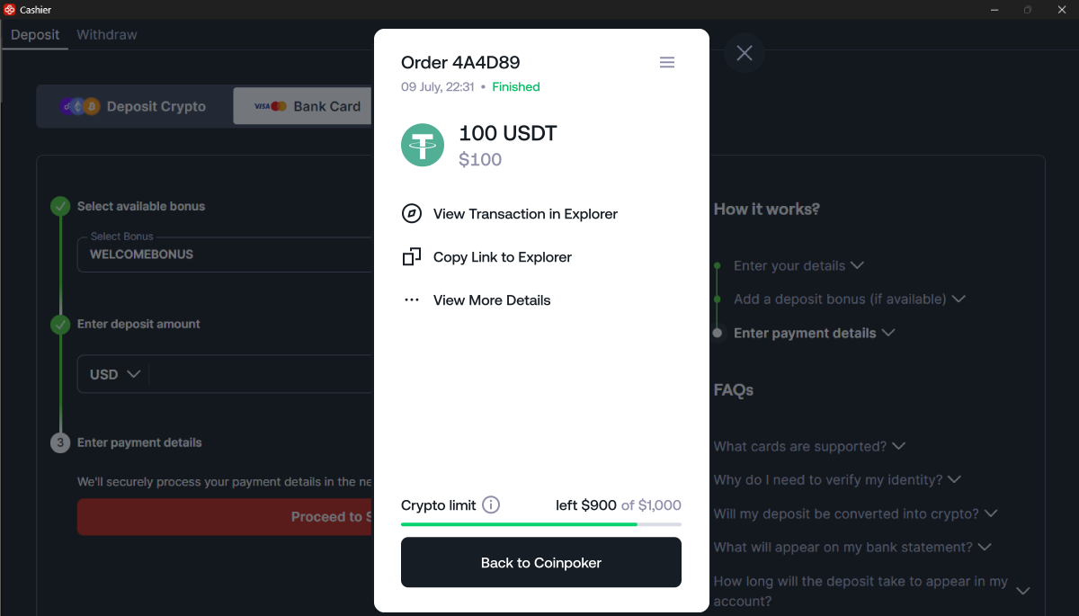 如果您的交易成功,您会看到状态显示为“已完成”,并且可以获取收据。资金将转换为 USDT,并显示在您的 CoinPoker 账户余额中。