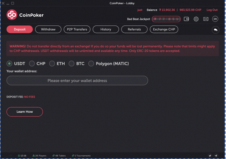 警告! 请勿直接从交易所转账CHP、USDT、ETH、Polygon MATIC!如果这样操作,您的资金将永久丢失。请注意,CHP提现可能会有额度限制。USDT提现将没有额度限制,且随时可用。仅接受以太坊和Polygon网络上的ERC-20代币。
