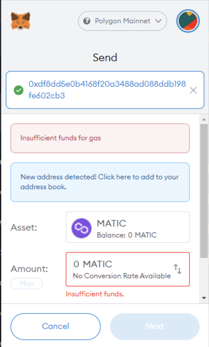 - 输入您的Polygon私人钱包地址(不要输入CoinPoker的地址)。请注意,CoinPoker不接受来自交易所的Polygon/MATIC、ETH或USDT存款。