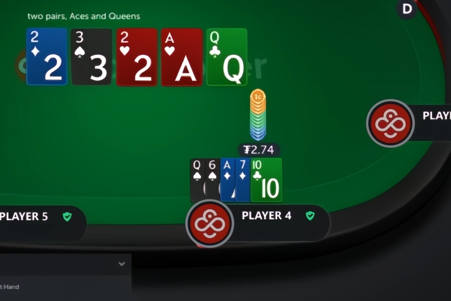 Image: By the river, the player has made two pair (Aces and Queens with a 3 kicker).
