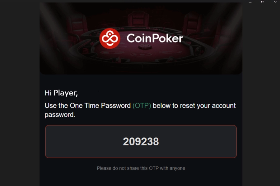 We’ll call this email “CoinPoker: OTP for Password Reset.” Depending on your email settings, it could accidentally get filtered into junk mail.