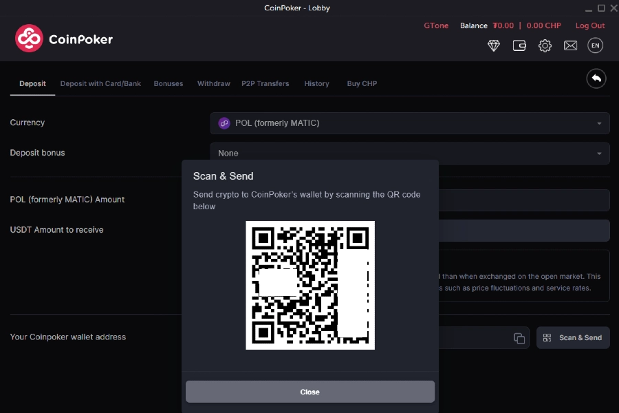 Send the same amount of POL you chose in the cashier to your CoinPoker wallet address.