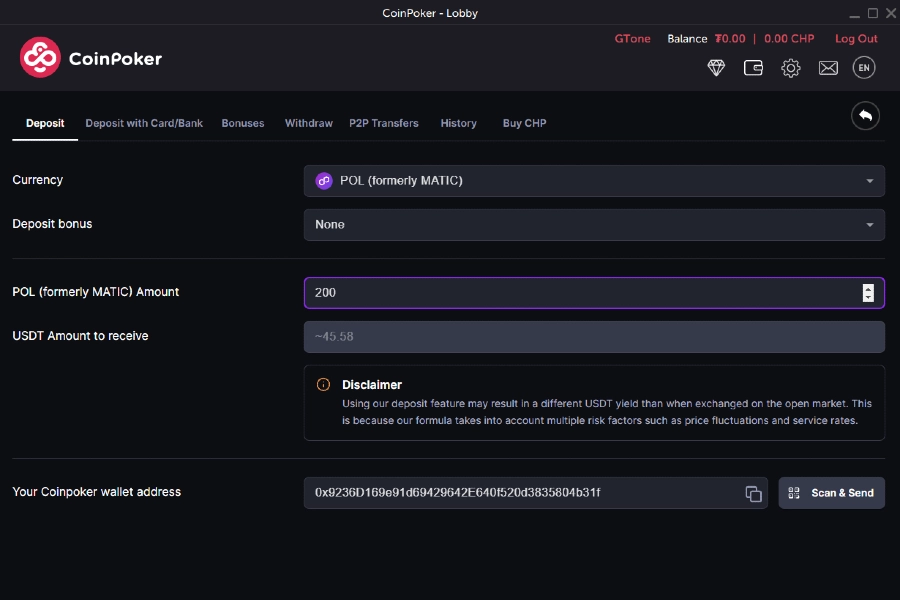 Currently, deposits and withdrawals from CoinPoker can be made using USDT, BTC, USDC, ETH, SOL, CHP and POL (formerly Polygon MATIC). With our deposits and withdrawals, CoinPoker provides a real-time global conversion rate with no fees, but slight rate differences are possible.