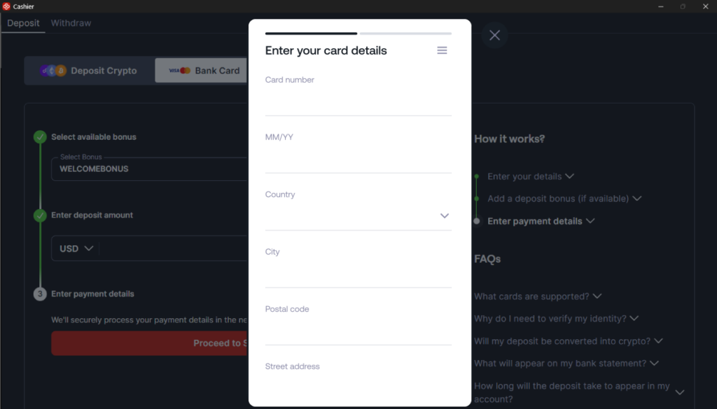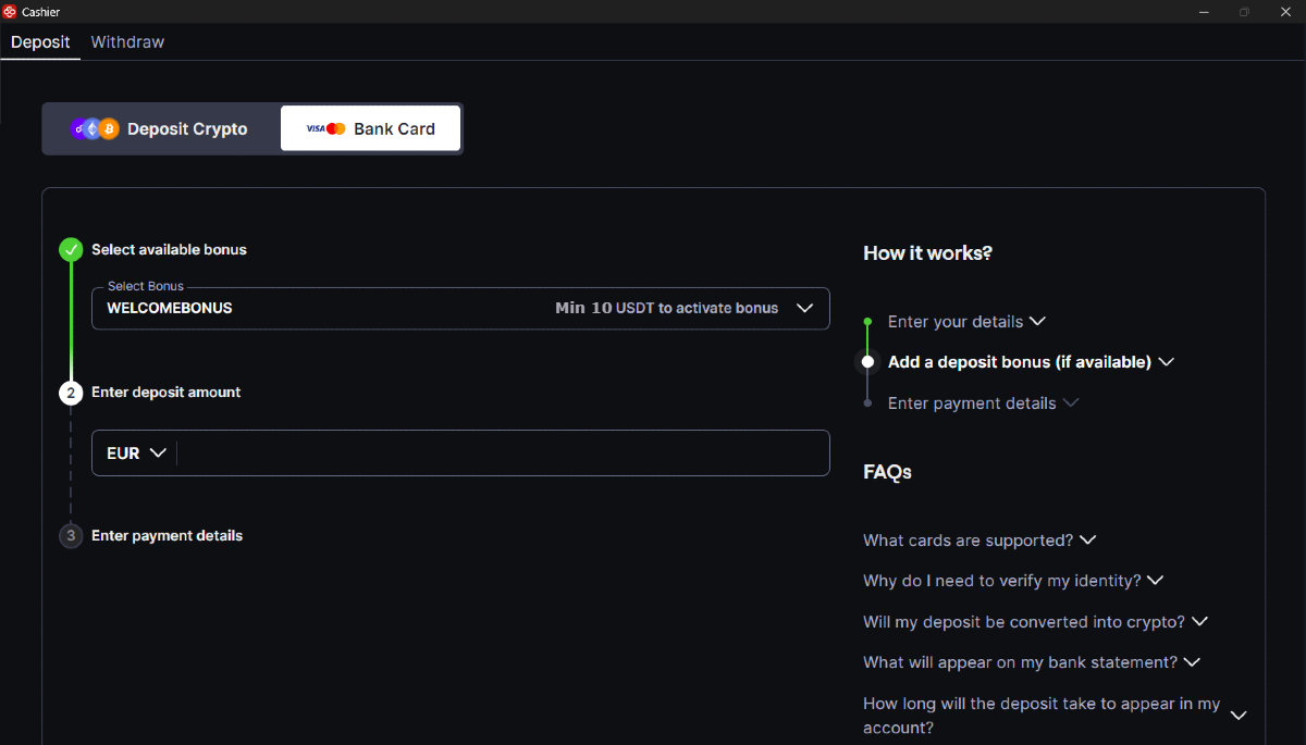 Go to the cashier by clicking on the wallet icon and selecting the option to Deposit. Next, select Bank Card beside Crypto.