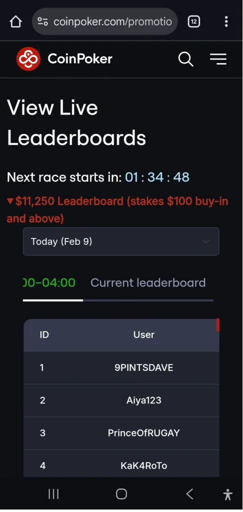 • Payouts: Winners receive prizes directly to their CoinPoker accounts within minutes after each CoinRace ends.