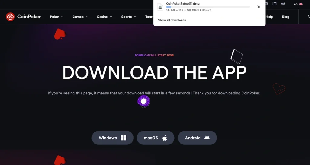 3. CoinPoker will detect your operating system and immediately begin the client download.