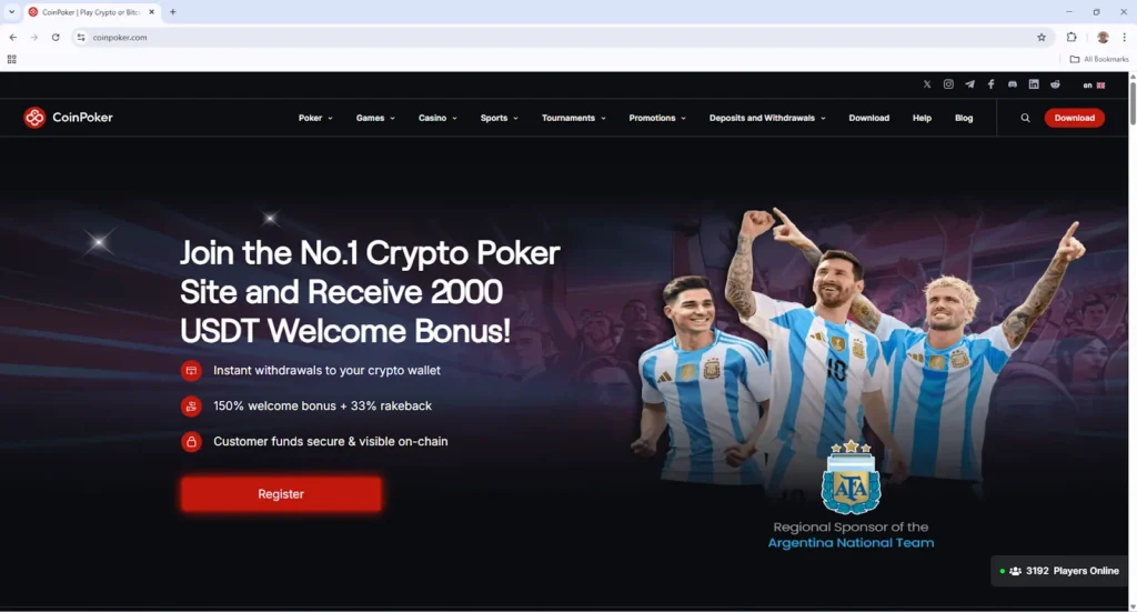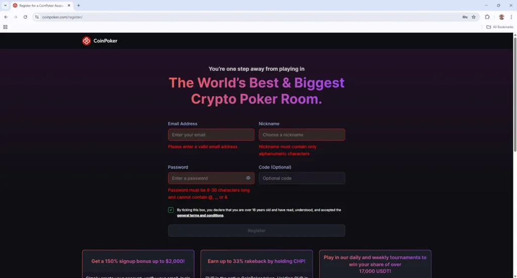 1. Open your web browser, navigate to www.CoinPoker.com, and click the Register button.