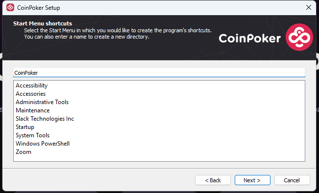 7. Select a Start Menu shortcut. CoinPoker is the default new directory name.