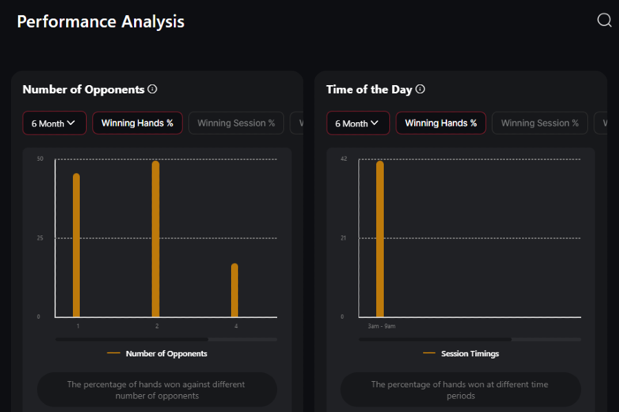 Check your Win Rate, Hands Played, Sessions Played, and even the length of your sessions, for cash games or tournaments.