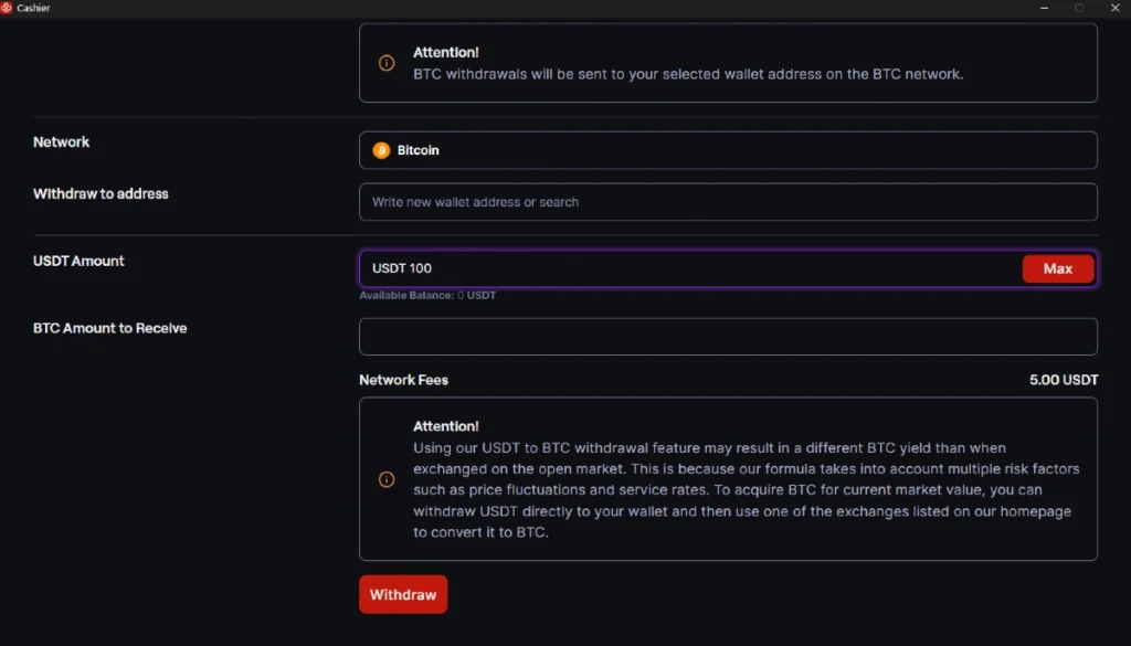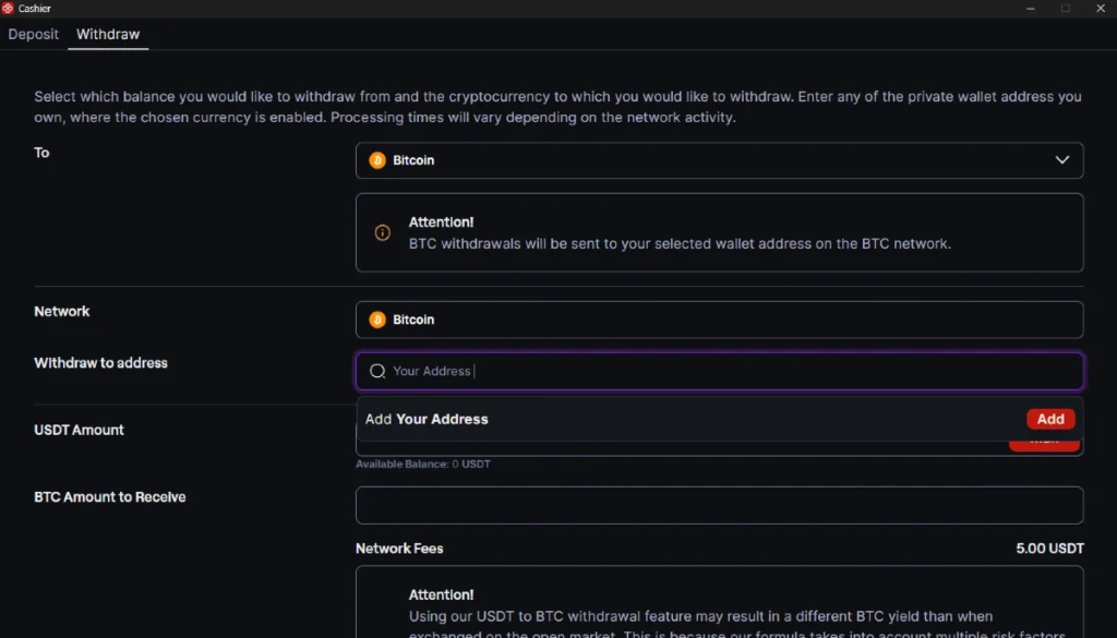 Choose the cryptocurrency you want to use for your withdrawal. We accept USDT, USDC, and BTC withdrawals.