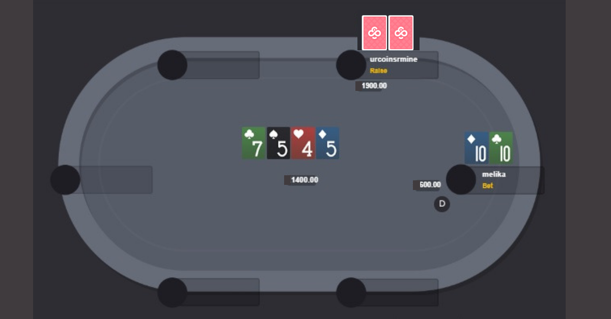 The turn is a 5d completing the rainbow texture. urcoinsarmine checks and I bet 600 into 1,400. I’m leaving 1,200 left in my stack for a value-shove on most river options. Here is where it gets interesting because urcoinsarmine decides to check-shove and is putting me all-in for the decision to call off my last 1,200 to win a pot of 3,800.