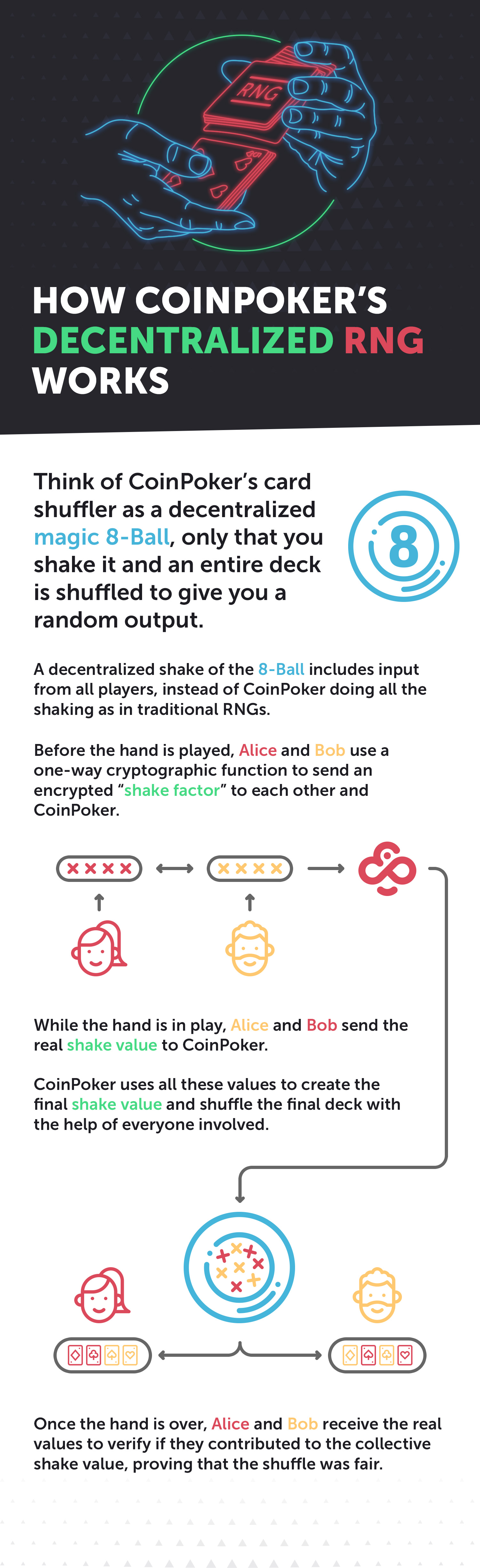 We have spoken about our decentralized RNG since launching, and now we are just about ready to release to the public! Pending a few final decisions, we aim to release the final version in the coming weeks. But first, we want to take this opportunity to explain how it all works. Before diving into the ... A Sneak Peek at Our Fully Decentralized Poker Shuffling System
