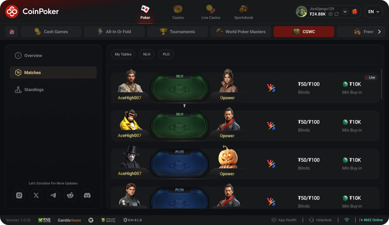 CoinPokerのデスクトップアプリから、いつでもHeads Up CGWCを視聴できます。