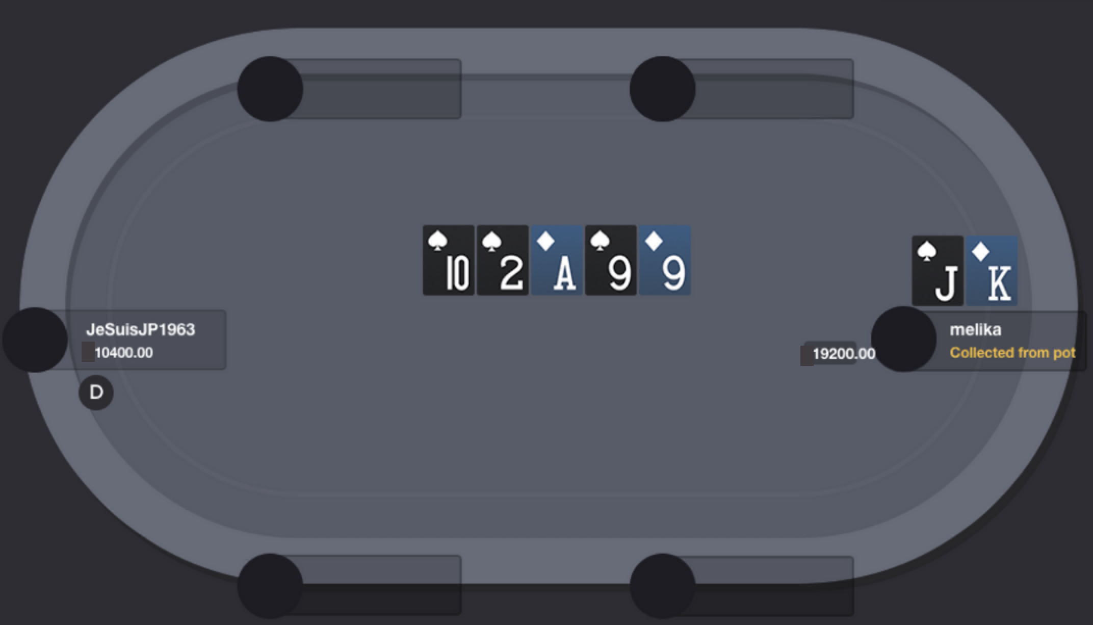 I go all-in with 10,221 into 19,200. JeSuisJP1963 folds and my play and bluff landed me the pot.