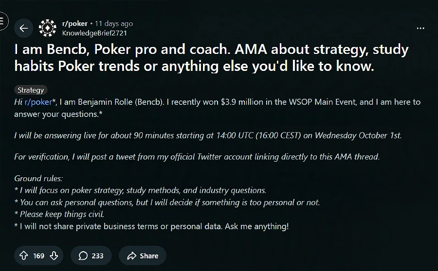 Ben’s AMA on Reddit drew a large crowd of poker enthusiasts. In the 90-minute session, he faced rapid-fire questions from fans worldwide, totaling almost one per minute!