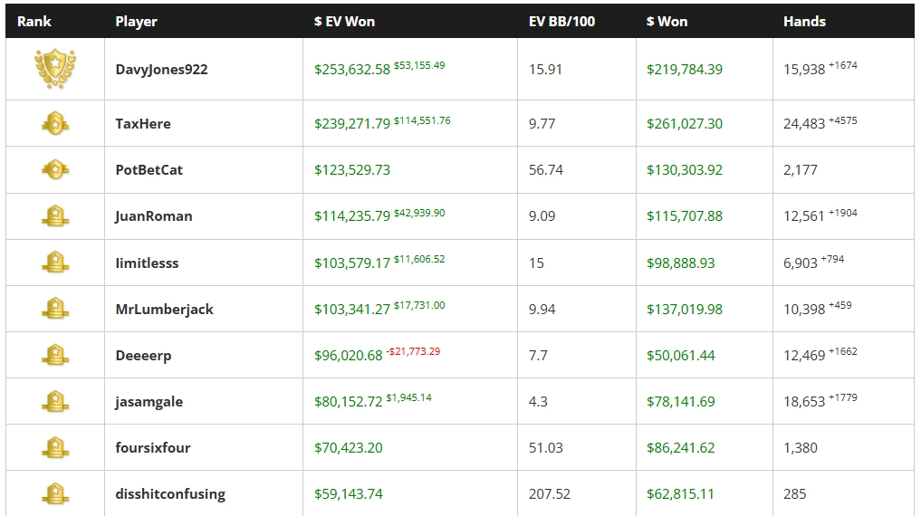 He sits firmly in first place with $253,632 $ EV Won, but the competition is relentless. Taxhere is right on his heels in second with $239,271, refusing to let him pull away. PotBetCat holds third place with $123,529 in $ EV Won.