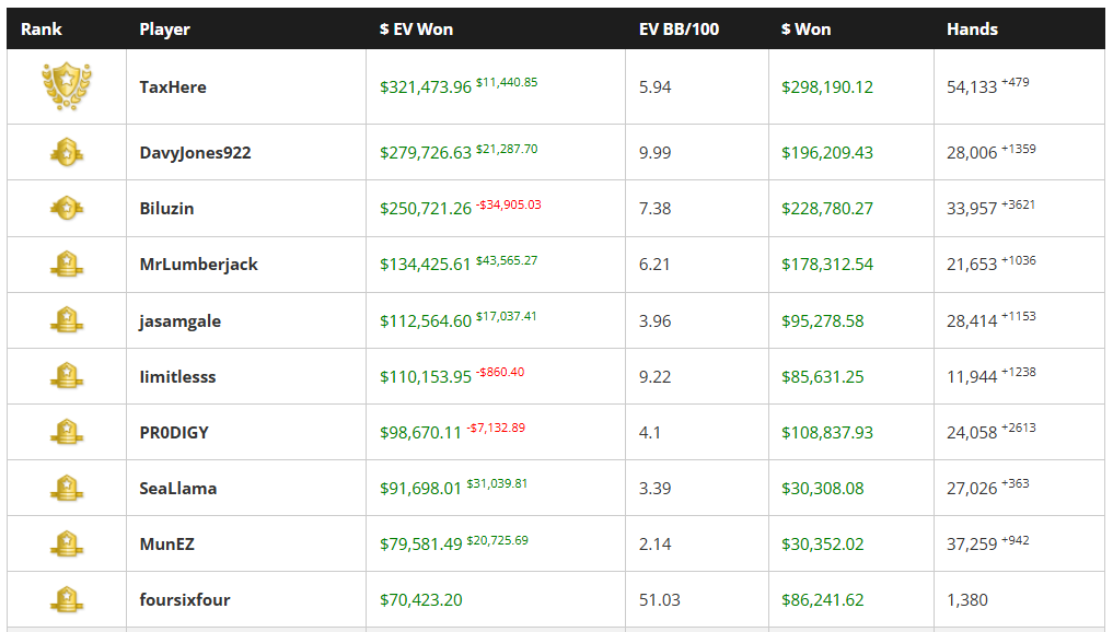 TaxHere reclaimed the top spot in the High Stakes Cash Game World Championship after a $123,613 session. This brought his total $EV won to $321,473. DavyJones922 remains close behind with $279,726