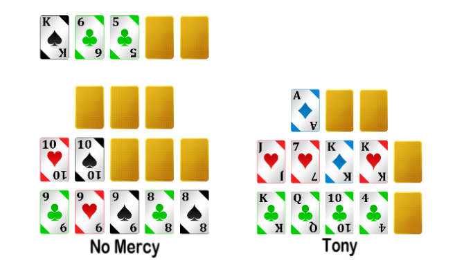 The first instinct that amateurs usually have is to place their biggest cards on the board, so the King would be placed on top or in the middle, along with the 6 that would go in the middle. The problem with that in this particular case, is that one of these two cards is completely dead. Indeed, there is no way in the world you will pair your King in the middle or on top, as 3 Kings are already showing in your opponent’s hand. Placing it on top as a high card will do you no good either, as your opponent is already showing an Ace on that line. However, if you look closely at both boards, you will see that the 6’s and the 5’s are fully live, so you’ll have a much better chance at making two pairs in the middle if you use those two cards.