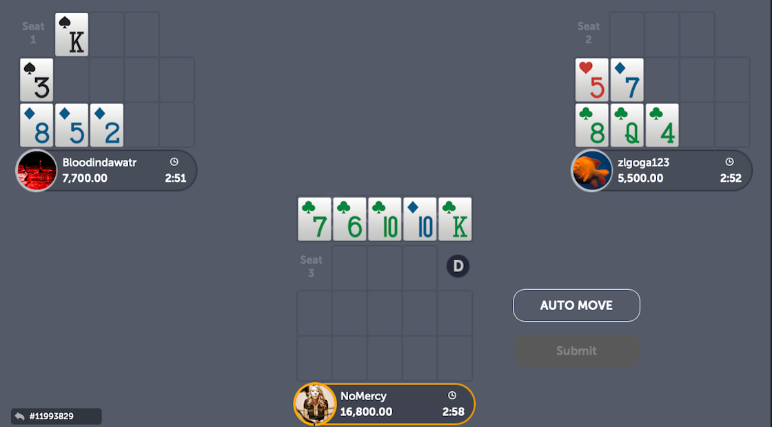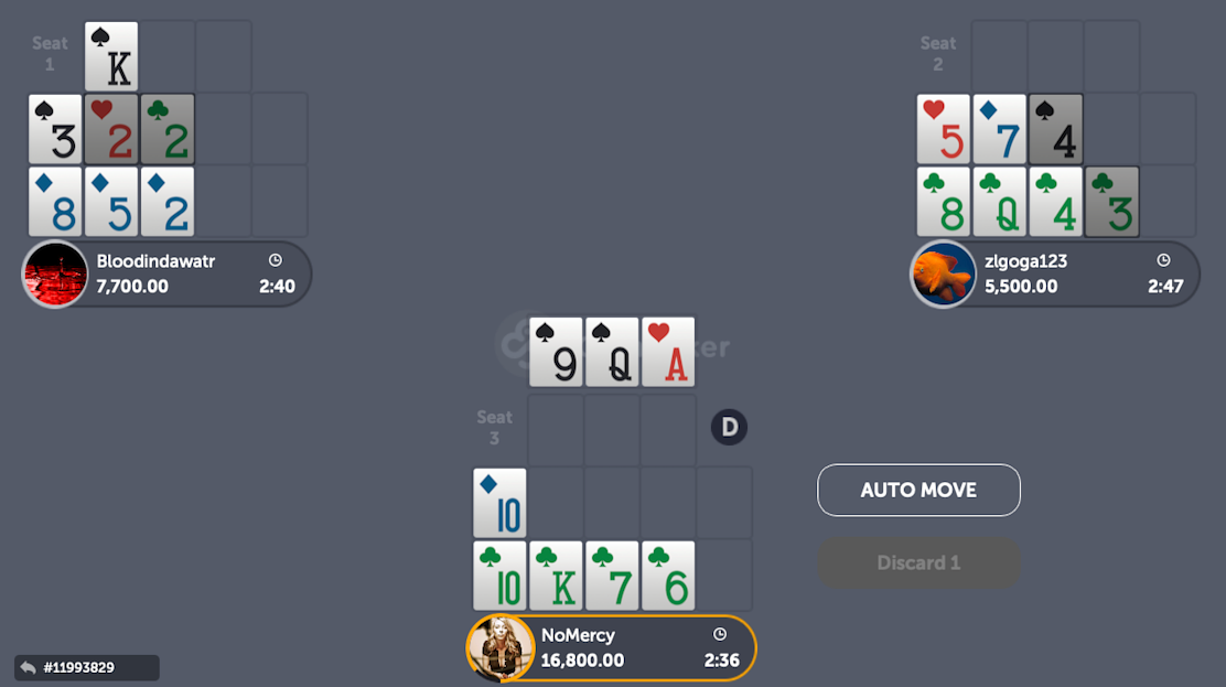 The first option here is the classic way to go: Flush in the back, Aces in the middle, Queens on top. This would be an automatic placement if the Queens were all live. But as you can observe in one of our opponent’s board, the Queen of club is now dead, which leaves us with only 2 Queens to access Fantasyland. Moreover, it will be really difficult to access it with a pair of Kings, since only 2 Kings are still live.