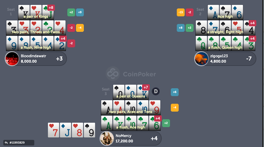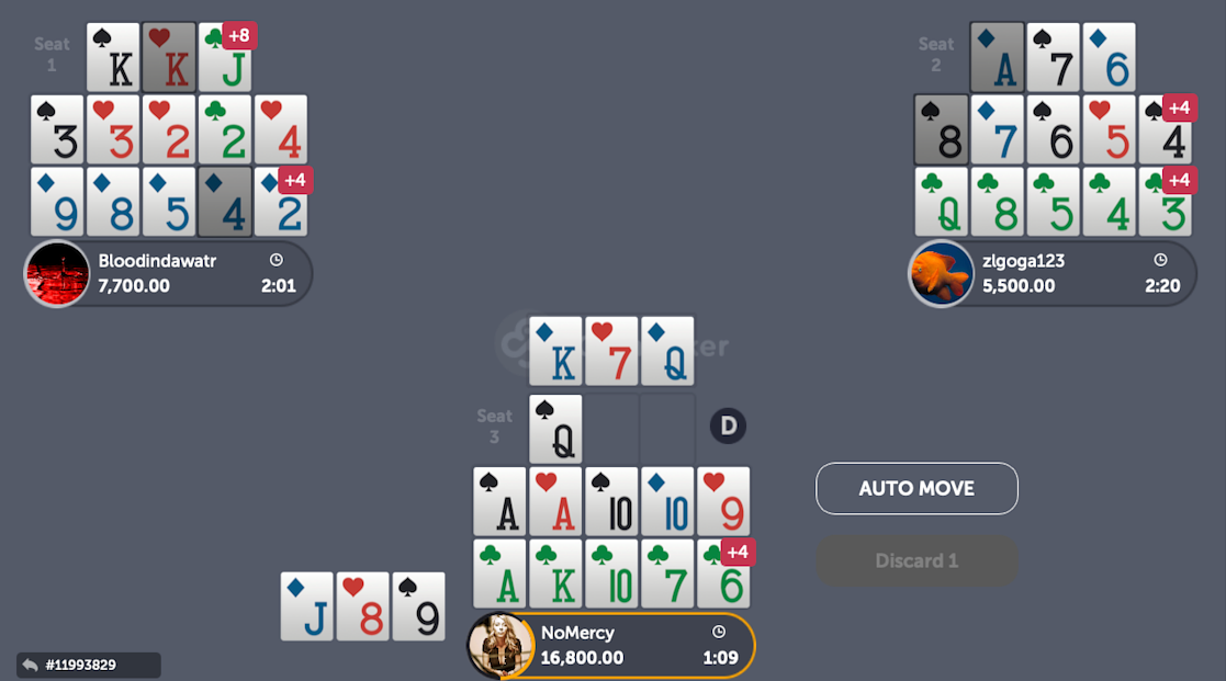 Plus, instead of making a mere 4 points as this is the case with our Queens on top, we would have made 7 points against our left opponent (1 for the Royalties and 6 for the scoop) and 6 points against our right opponent (5 for the Royalties and 1 for the lines), for an amazing total score of 13 points instead of 4!