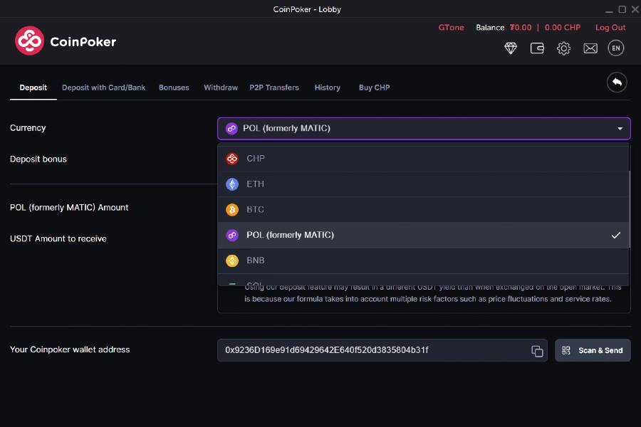 5. Make a deposit using a crypto wallet or bank card. CoinPoker accepts Visa, Mastercard, and major cryptocurrencies.