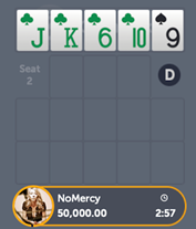 In such a case, you should play your 4 cards Flush draw in the back. Indeed, it would be a really long shot to try drawing to 2 perfect cards in order to make a Royal Flush or a Straight Flush with your initial 3 cards. Moreover, completing this bottom row with 2 more clubs would imply that you ended up with a minimum of 6 clubs in your hand, which does not happen too often. That’s why you should place your 4 cards Flush in the back and try to fill up that row for a royalty of 4 points.