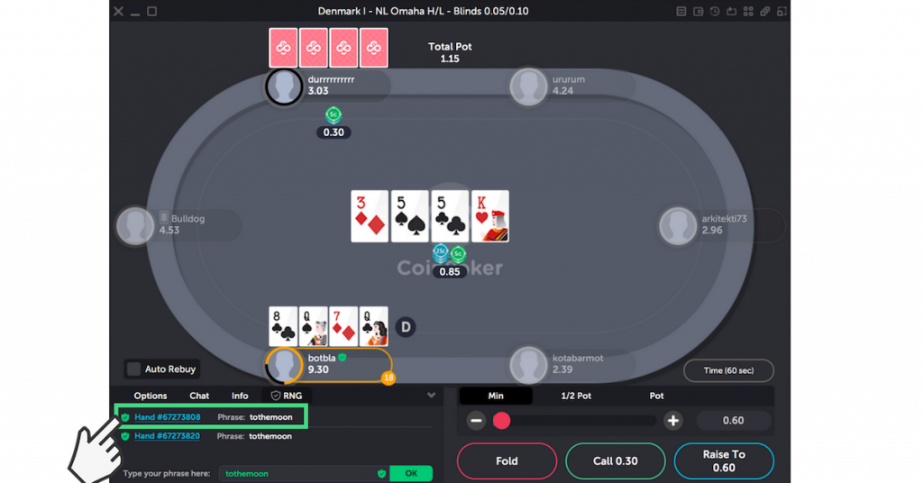 參與的過程從所有玩家使用一種單向加密函數開始,並帶有一個秘密的“搖動因子”,將其發送給其他所有玩家和CoinPoker。CoinPoker利用所有這些值來創建最終的搖動值並洗出最終的牌組。