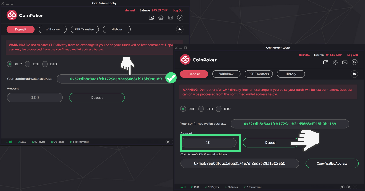 您首次存入ETH或CHP時所使用的錢包地址,將會被確認並連結到您的帳戶。請按照下方指示,小心地在指定欄位輸入您的地址,並選擇您要存入的ETH或CHP數量。